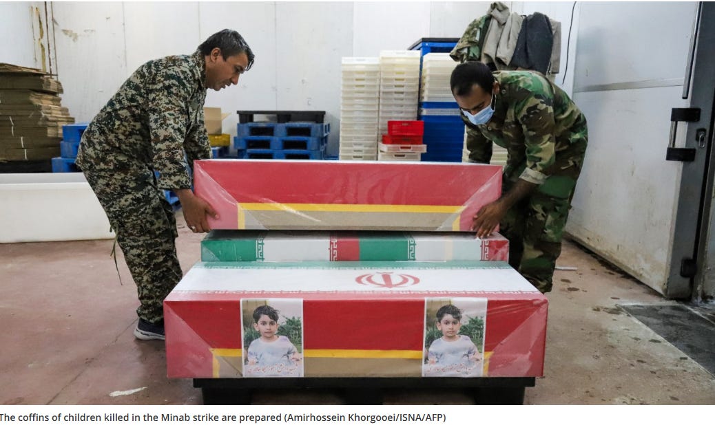 Included in that widely touted target list was an all-girls elementary school, seemingly hit by one of our aforementioned Tomahawk missiles [6]. The death toll is uncertain but estimates are around 180, the list of known victims and their ages is available from Middle East Eye [7]. Many of them are less than 10 years old. Trump, thinking Americans will believe anything he says, blames Iran for bombing the school. That has already been refuted by multiple corporate media sources. The next ‘defense’, if complete denial fails, will be ‘collateral damage’. At one point I might have believed that, but we have a sordid history of covering war crimes. From the genocide in Gaza to the crimes committed on Epstein’s island, far too many ‘world leaders’ have shown how little they care for the innocent and how evil they truly are.