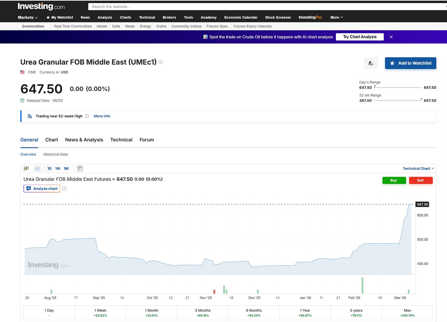 The Gulf states are not the only ones facing food consequences, roughly a third of the world’s fertilizers typically travel through the Strait [13]. The chart below shows a ~33% increase in price for granular urea (ammonia). In 2022 when the world was exposed to ‘fertilizer shock’ due to the start of the Russia/Ukraine War, prices rose to ~$900 per ton ($250-300 more than they are today depending on which contract you view). CSIS stated “Russia’s invasion of Ukraine pushed global food prices to all-time nominal highs in 2022” [14]. If the supply disruption continues to force fertilizer prices upward, a similar shock could again push global food prices higher.